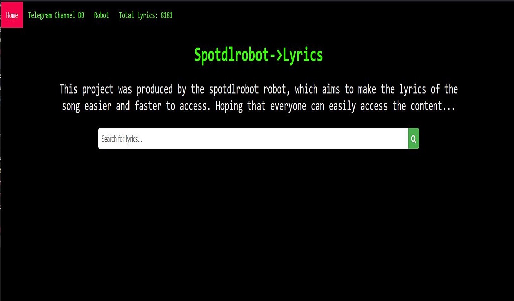 بعد از اینکه شما وارد صفحه اصلی این پروژه بشید -> Lyrics در قسمت سرچ باکس میتونید کلیدواژه خودتون رو سرچ کنید تا نتایج برای شما نمایش داده شوند. به روش های مختلفی میشه این پروژه رو بالا اورد که من سریع ترین حالت ممکن برای نمایش و دسترسی رو انتخاب کردم( حالا در ادامه تغییرش میدم همین:/ ) همینطور میتونید از بالای سایت به تعداد لیریک های موجود در دیتابیس، کانالل دیتابیس و همینطور ادرس ربات دسترسی پیدا کنید.